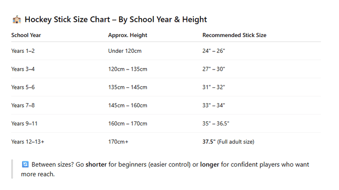 At Pure Sports & Leisure, we’ve simplified it all. Here’s a clear guide to picking the right size stick using school year, height, and one easy at-home measurement trick.