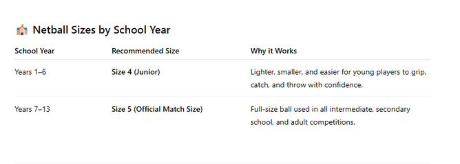 Year 7 and up: Size 5 all the way. That’s the match standard across New Zealand netball.
