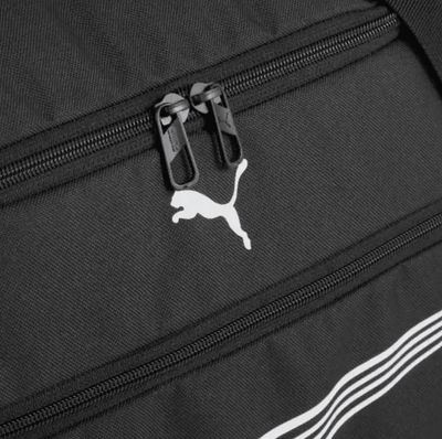 Two-way zip opening into main compartment, zip opening into front pocket and side pocket, zip opening into lining pocket inside main compartment, side mesh pocket, PUMA branded 150D Polyester lining with PU backing, webbing carry handles with padded handle grip connectable through hook and loop closure, bi-color webbing carry handle on side panel, fully attached and adjustable shoulder strap with shoulder pad, padded base panel, PUMA branded metal zip pullers on main compartment, branded metal zip puller on side compartment, PUMA wordmarked reflective tape on front panel, large Formstip and PUMA Cat logo print on front panel.