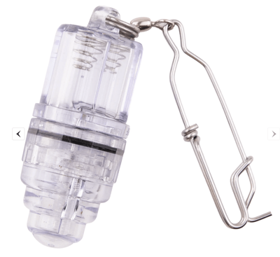A single high-output LED cycles through green, blue, purple, and red, creating a subtle bioluminescent flicker that draws attention without spooking fish. A heavy-duty stainless steel shark clip makes it simple to secure the light to dropper rigs, leaders, or baits, while withstanding the punishment of deep-water use.