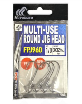 The Hayabusa Multi-Use Round Jighead offers exceptional versatility for finesse fishing. Its rounded head reduces snags, while the short shank and wide gap Hayabusa hook provide optimal bait action and secure hooksets. Features a double-ring bait keeper and a stealthy matte black finish.