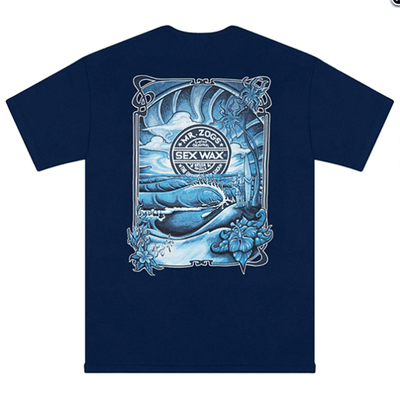 A classic retro surf scene from Drew Brophy in shades of blue with Sexwax appearing as the rising sun. This art is akin to some of the best t-shirt graphics from the 60's and 70's. Single color Sexwax logo printed on front left chest with Drew's masterpiece on the back. Loose fit 6 oz. 100% Cotton T-Shirt.